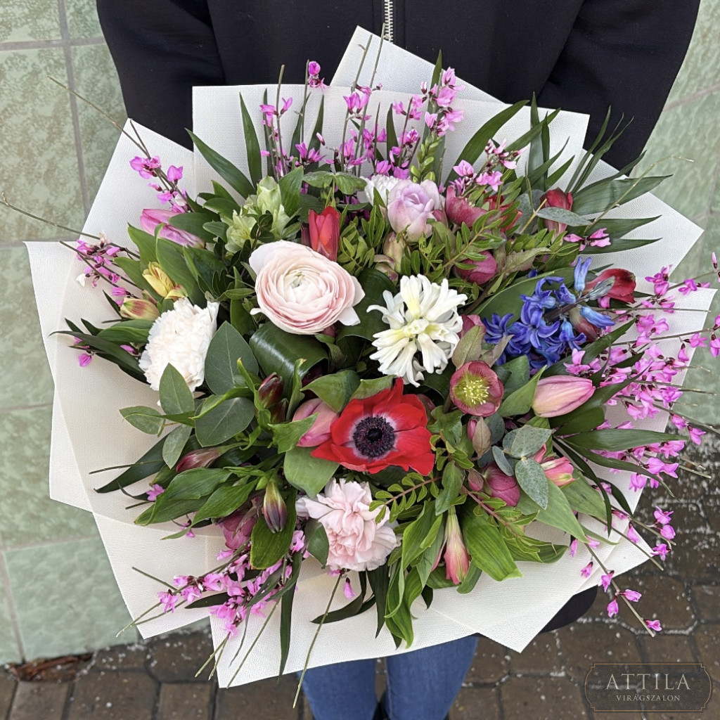 Az üzletben lévő legszebb tavaszi virágot válogatjuk össze egy csokorba. Kb 45 cm átmérőjű. Több méretben rendelhető.
