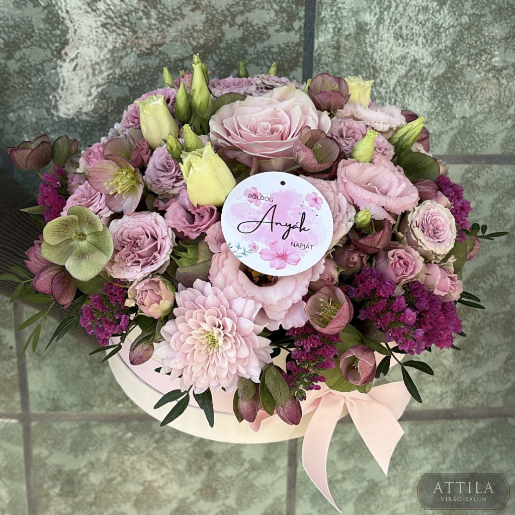 Ez a 20 cm átmérőjű rózsaszín árnyalatiban összeállított virágdoboz tökéletes választás, ha valami igazán különlegeset keresel. Más színben is rendelhető.