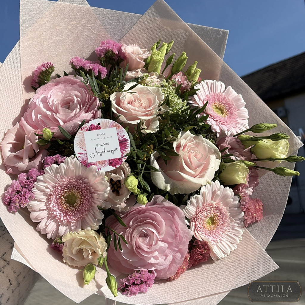 Legszebb rózsaszín virágokat válogatjuk össze ebbe a gyönyörű virágcsokorba. Több méretben rendelhető. A képen az M méret látható.